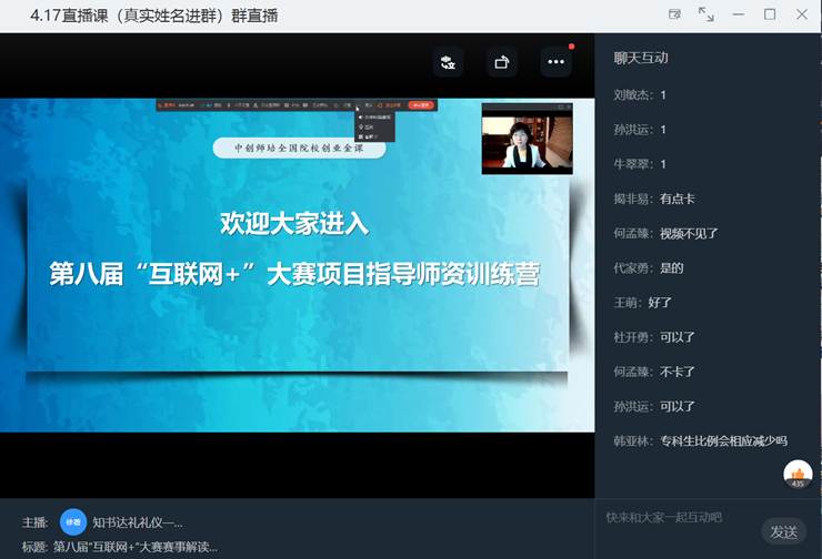 2022年4月1日至4日,4月18日至20日期间,双创公司派王铮经理、任广华老师参加了由中创师培举办的第八届中国国际“互联网+”老员工创新创业大赛备赛训练营。训练营采用线上直播的方式,由国赛获奖项目指导专家老师陈芳、徐培培授课,培训主要内容包括:第八届“互联网+”大赛解析、大赛项目挖掘与培育、金奖案例剖析、如何打造具有金奖基因的项目、项目PPT与计划书的撰写。