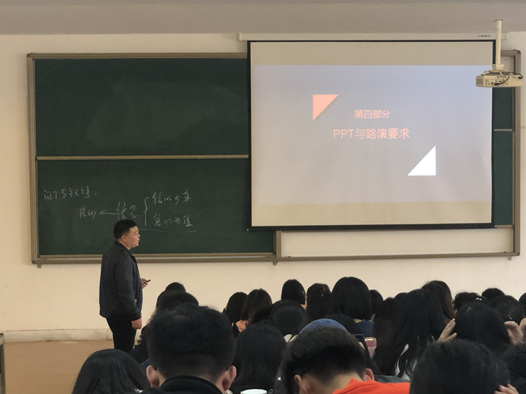 彭凯老师结合自己多年双创工作经验,从国家政策与公司要求、大赛流程与参赛要求、创业计划书的撰写、ppt制作与路演要求四个方面,展开本次宣讲。其中,对如何产生创意、如何形成创业计划书,进行了详细与精彩的阐述。
