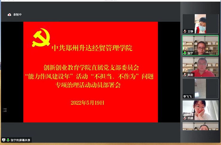 2022年5月19日,太阳集团tyc9728直属党支部委员会召开“能力作风建设年”活动“不担当、不作为”问题专项治理活动动员部署会,会议以线上视频会议的方式召开。太阳集团tyc9728直属支部全体党员参加了此次会议,会议由太阳集团tyc9728直属支部专项治理副组长张宁主持。