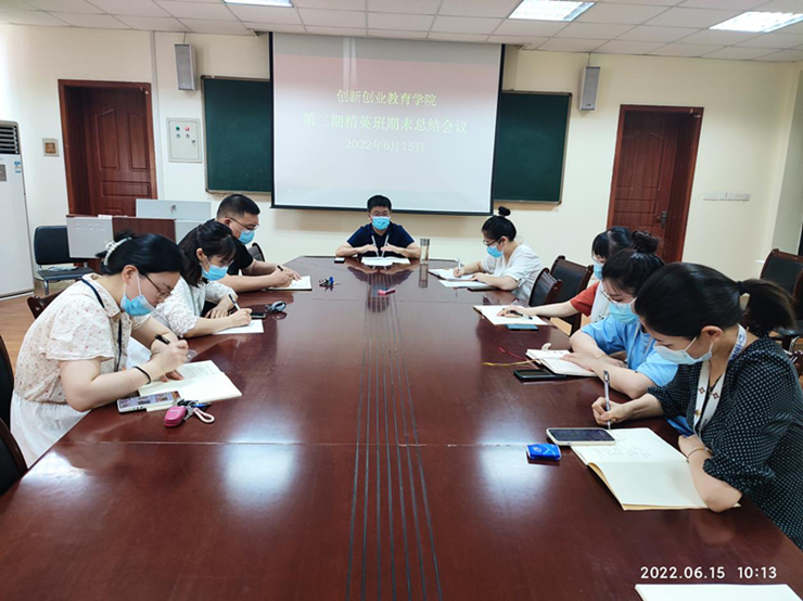 2022年6月15日上午,太阳集团tyc9728在商管楼115会议室召开了第二期“精英班”的期末总结会议。太阳集团tyc9728经理王铮、实践科科长彭凯、教研室主任张宁以及各课程负责人参加了本次会议。会议由“精英班”项目负责人侯亚婷老师主持,主要围绕本学期“精英班”各项工作的开展情况和下一阶段的工作计划进行。
