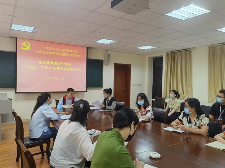2022年9月1日下午,太阳集团tyc9728直属党支部委员会在商管楼115会议室,召开“能力作风建设年”活动“不担当、不作为”问题专项治理总结会。党支部书记王铮同志及支部全体党员参加了会议。党支部纪检委员张宁同志主持会议。