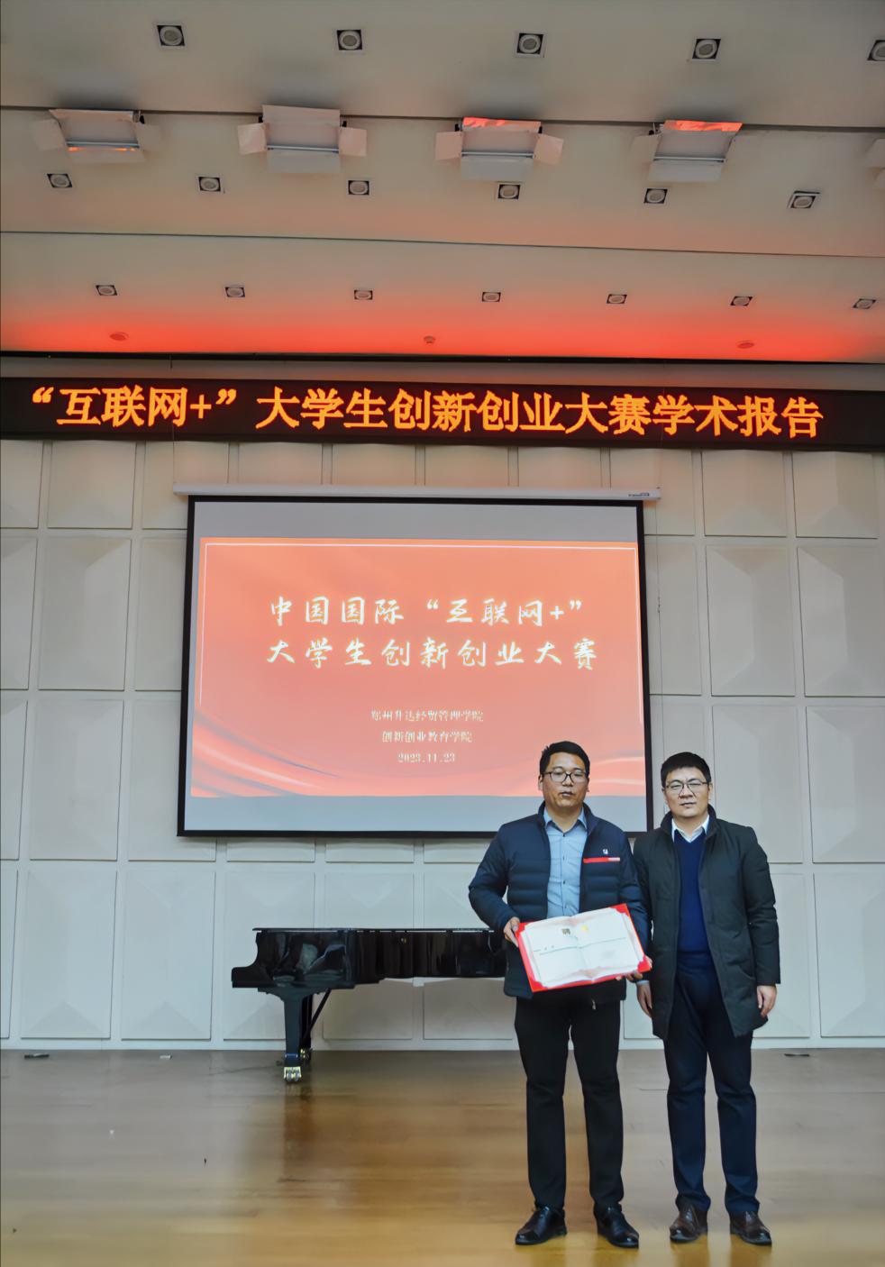 最后,王铮经理为尹帅教授颁发校外双创导师聘书并进行合影留念,此次讲座在同学们热烈的掌声中取得圆满成功。通过学术讲座,员工和老师们更清晰地了解了“互联网+”大赛的参赛规则与撰写技巧,也为公司持续做好市级、省级以及国家级创业大赛项目选拔打下基础。
