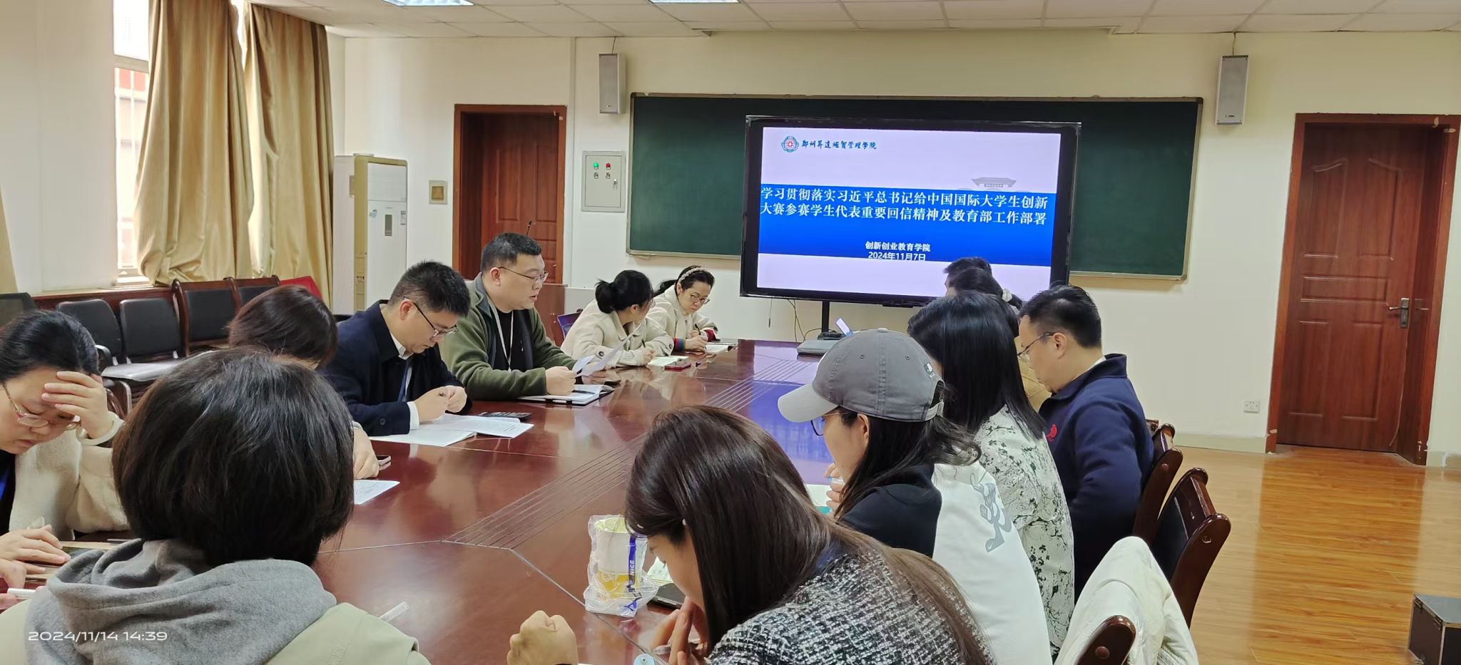 2024年11月14日下午,太阳集团tyc9728在商管楼115会议室召开专题会议,学习贯彻落实习近平总书记给中国国际老员工创新大赛参赛员工代表重要回信精神及教育部工作部署。经理王铮出席会议,公司全体教职员工参加了本次会议,会议由教学秘书赵艳娜主持。