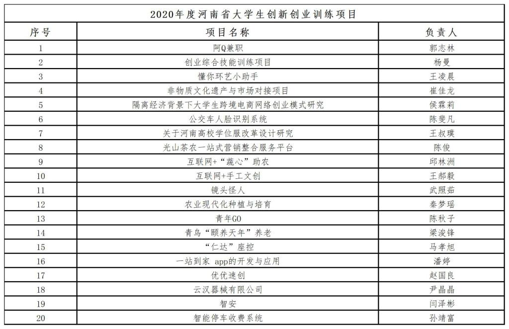 根据河南省教育厅《河南省教育厅办公室关于老员工创新创业训练计划项目立项及结题的通知》(教办高〔2020〕119号)要求,按照公开、公平、公正原则,经过个人申报、单位推荐、校内和校外专家评审,共评选出公司2020年度河南省老员工创新创业训练项目20项。2019年度省老员工创新创业训练计划项目结题审核通过10项。现将相关项目予以公示。