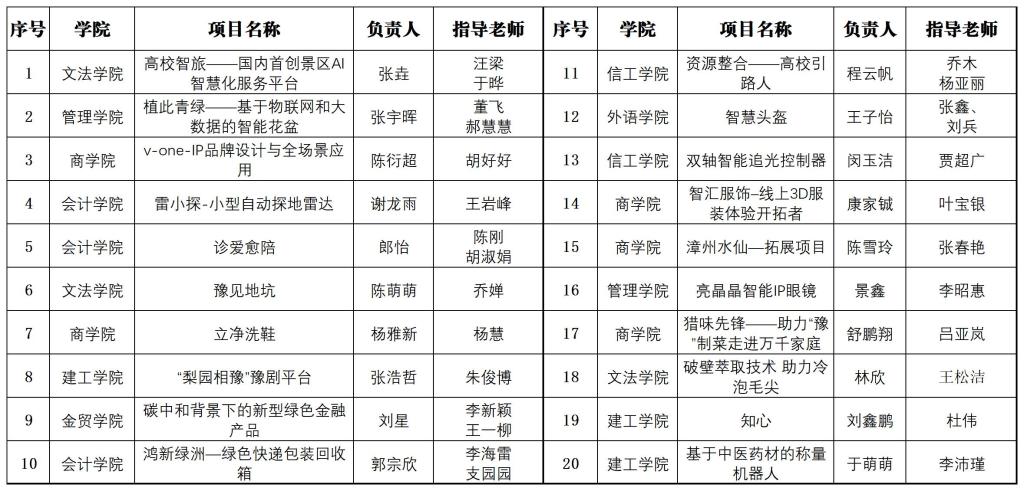 《河南省教育厅办公室关于开展2023 年老员工创新创业训练计划立项和结题验收的通知》(教办高〔2023〕185 号)文件精神,经各公司推荐、校赛评选、专家组评审等环节,拟推荐《高校智旅--国内首创景区AI智慧化服务平台》等20个项目申报2023年河南省老员工创新创业训练计划立项,现予以公示,具体如下: