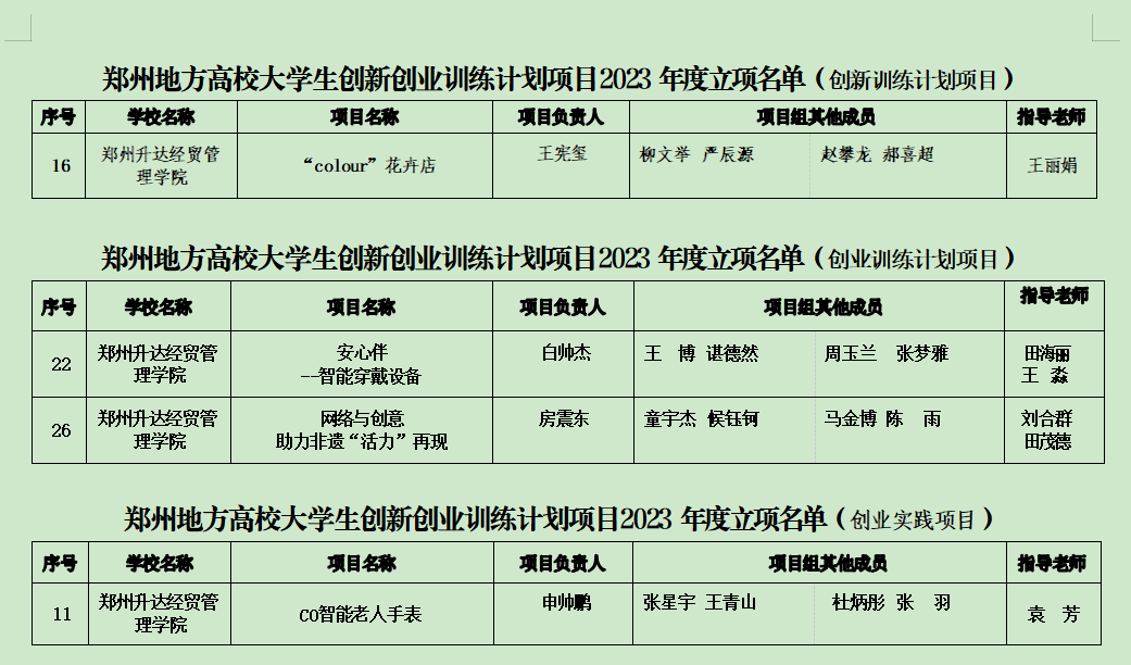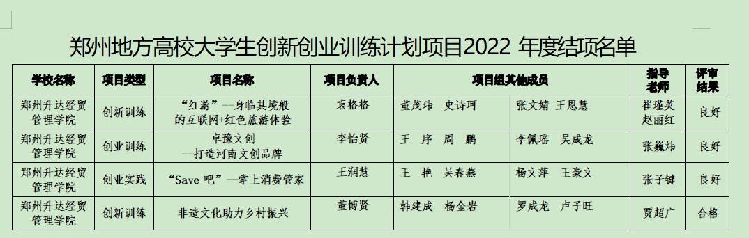 根据《郑州市教育局办公室关于公布郑州市地方高校老员工创新创业训练选计划项目2022年度结项及2023年度立项结果的通知》【郑教高函〔2023〕851号】,公司2022年度立项的4个项目顺利通过结项,其中3项被评为市级良好项目。2023年度,公司共获批立项市级项目4项。项目成果绩效的具体要求,在组织立项项目会议时具体通知。