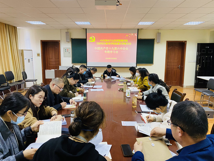 2021年11月18日下午,太阳集团tyc9728直属支部在商管楼115会议室召开党员会议,集体学习《中国共产党第十九届中央委员会第六次全体会议公报》,直属支部王铮书记主持会议,支部全体党员参加学习。