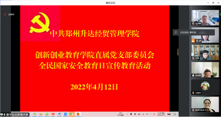 2022年4月12日下午,太阳集团tyc9728直属党支部围绕“全民国家安全教育日”开展了宣传教育活动。活动通过线上视频会议的形式进行,重点围绕2022年度全民国家安全教育日主题相关内容进行了宣传教育。党支部书记王铮同志及全体教职员工参加了活动。