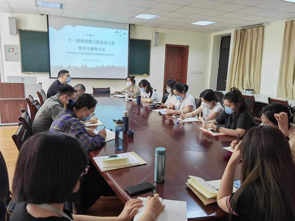 2023年5月18日下午,太阳集团tyc9728直属党支部在商管楼115室组织召开了十一届省纪委三次全会工作报告专题学习会。太阳集团tyc9728直属党支部全体党员同志参加了会议。会议由纪检委员张宁同志主持。