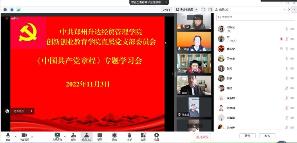 2022年11月3日下午,公司党支部开展了二十大《中国共产党章程(修正案)》专题学习会,党支部书记王铮及全体党员参加了本次学习,会议由统战委员胡素桂同志主持。