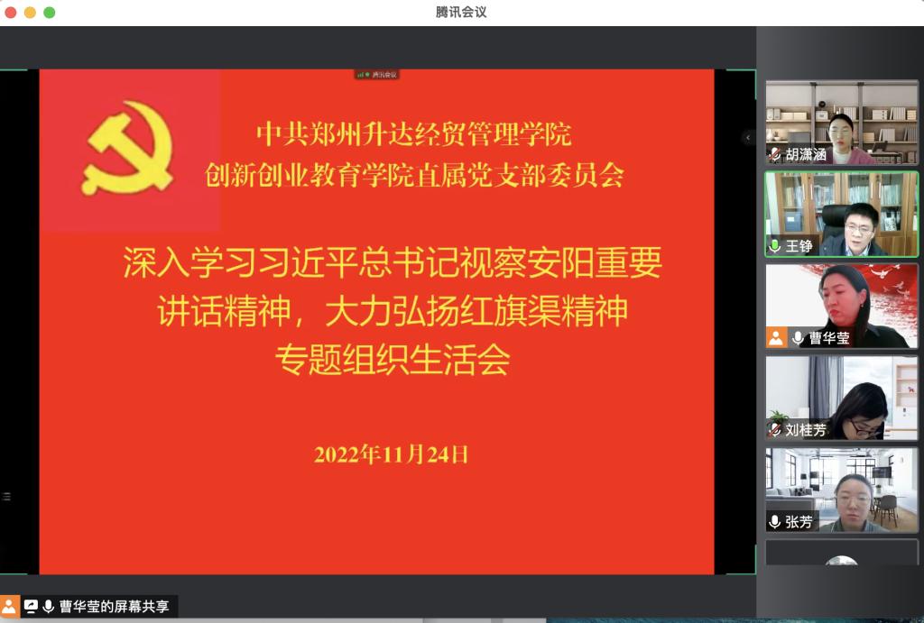 为深入学习贯彻党的二十大精神和习近平总书记视察安阳重要讲话精神,不断增强党支部的组织力、凝聚力、战斗力,深刻领会、弘扬并践行红旗渠精神,2022年11月24日,太阳集团tyc9728直属党支部以线上会议的方式召开了学习“红旗渠”精神专题组织生活会,会议由党支部书记王铮同志主持,支部全体党员参加了会议。